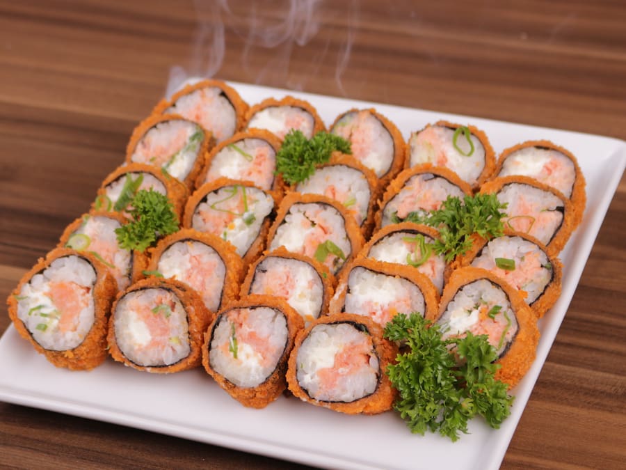 12 Hots Filadélfia Crocantes (alga, arroz, salmão cream cheese e cebolinha) empanado e frito na massa crocante panko!